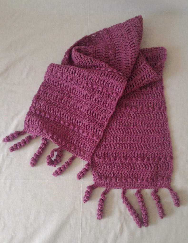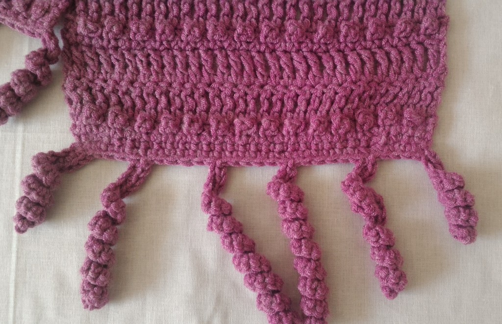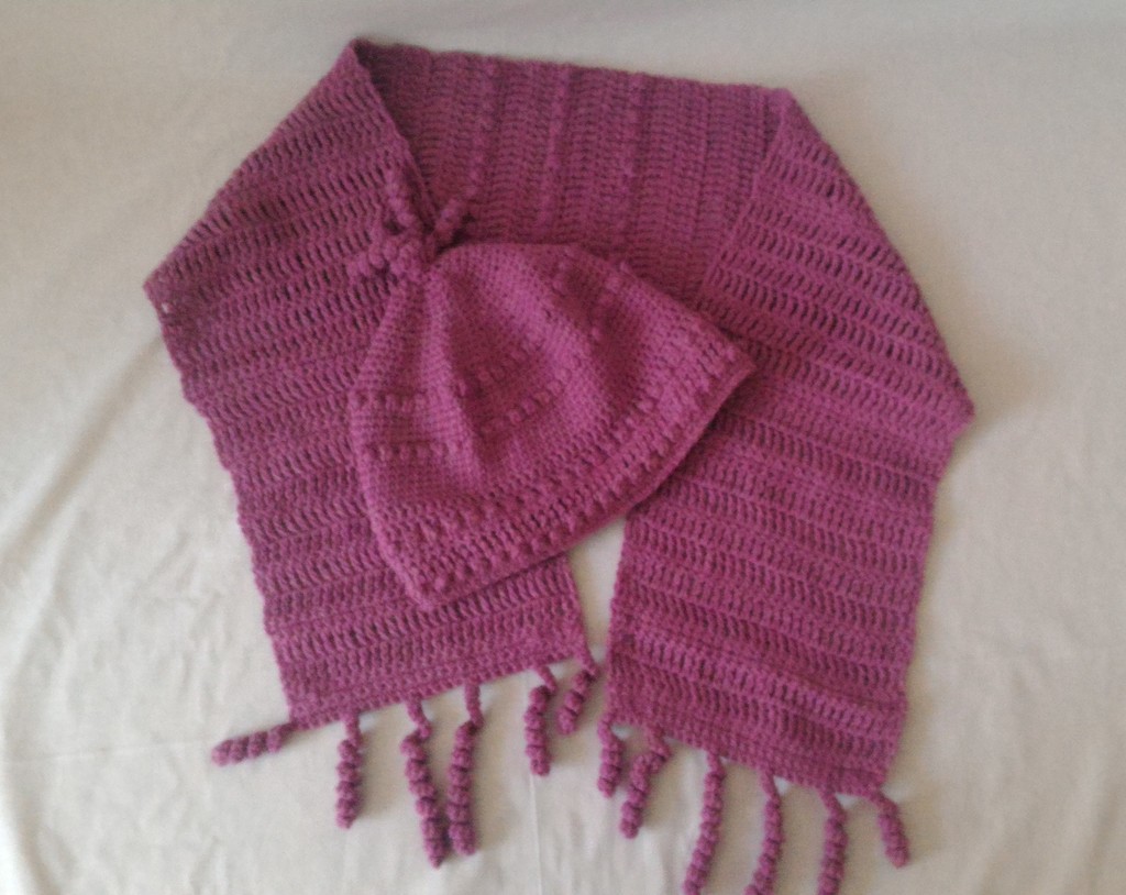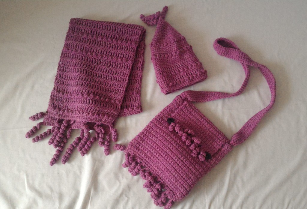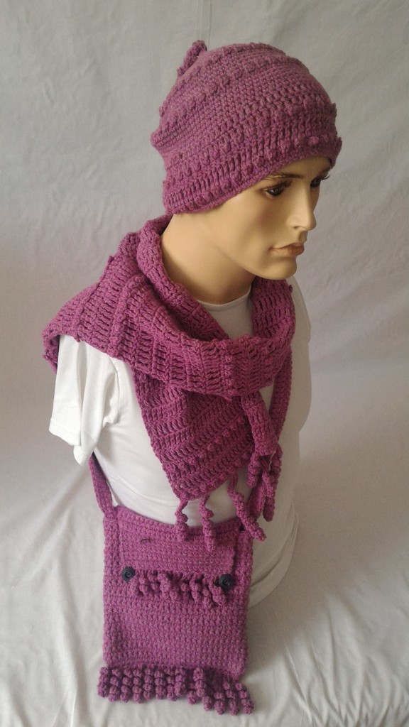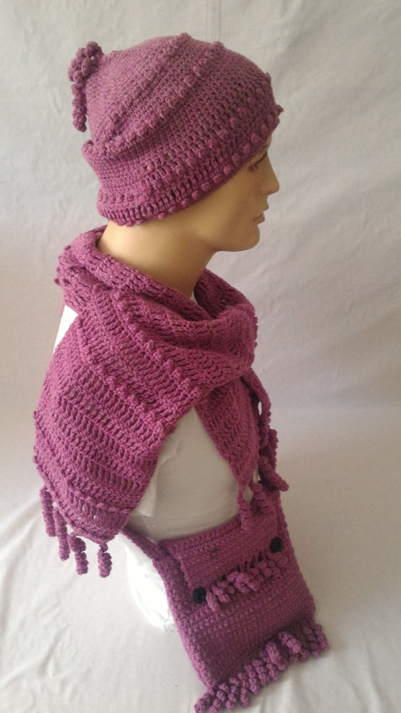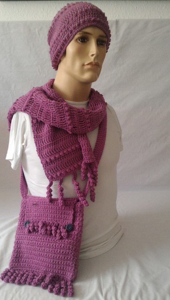 Mütze / Schal / Tasche - Lila mit Knöpfe und Schillerlocken