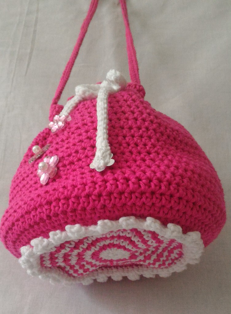 Tragebeutel - Pink / Weiß mit Kordel, Blumen und Perlen